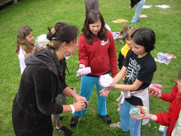 A začal nám klasický táborančový život! Jak? No přece budíčkem :-)! Na vstávání a oblékání máme čtvrthodinku a po ní se společně přivítáme - v kruhu se chytneme za ruce a pošleme si dokola pozdravení. A hnedky pěkně bosky stíráme rosu z trávy, je to príma a prý i zdravé. Po oběhnutí ranče cvičíme na podložkách Pět Tibeťanů. Nejvíc se nám líbí první Mlýnek, to se vrtíme jako vrtulník :-). Ale i ostatní cviky jsou zajímavé. Ranní hygienu jdeme dělat už úplně probuzení a po ní už zvoní nástup na snídani. Paní kuchařka je moc hodná a ptá se každého, kolik chce - to ale pak musí sníst, takže si dáváme raději poprvé míň a jdeme si přidat. To má pak radost :-). Po snídani přijela velká kamarádka Bára a začali jsme připravovat trička, polštářky a šátky k batikování. Naše výtvory uvidíte doma, možná i na fotkách. Při tvoření uběhlo dopoledne jako voda a po obědě jsme měli polední klid pro odpočinek a psaní dopisů. To už začalo pršet a že na České Sibiři umí pršet! Část z nás začala s výrobou šperků z korálků, kamínků a dřívek, část vyrazila o dešťové přestávce dojit kozičky. Obě skupiny byly úspěšné. Abychom měli dobrou náladu (a my ji měli), zahráli a zazpívali jsme si spolu s náčelníky, až se kuchyň třásla. Když vysvitlo sluníčko, vypravili jsme se na velkou procházku se zvířátky (byl velký zájem o vodění koziček, koníky vedli vedoucí a ti zkušenější z nás), pro jistotu v pláštěnkách a gumovkách. To bylo dobře, protože návrat byl opět deštivý. V kamnech ve studiu už praskala borová polena a tak jsme rozvěsili mokré oblečení a připravili společné spaní - náčelníci totiž rozhodli, že se dnes bude spát v teple u kamen. A ještě kroužek AHA se spoustou zážitků, Rada mladších s dokončením pravidel Táboranče, večerní mytí, čtení o zvířátkách a už jsme spali. Někteří si zase nedoposlechli celý příběh :-). Tedy spí se tady moooc dobře, jako když do vody hodí.