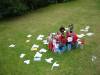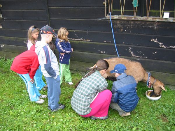Den začínáme jako obvykle budíčkem, pokračujeme ranním pozdravem a rozcvičkou, tu nám dnes vylepšili náčelníci tím, že na konec běžeckého pelotonu nasadili "zlého" muže Aleše, který popoháněl ty rozteklejší z nás, to nám to najednou běhalo :-)! A už je tu snídaně, úklid a jeho vyhodnocení, a tím máme hotové každodenní ranní prácičky. Hned jsme navázali dokončením výroby domácího sýra, vybrali jsme sýřeninu a nechali ji vykapat v uzlících. Také jsme ochutnali syrovátku, má docela dobrou nakyslou chuť. No, na sýr si ještě počkáme, až sýřenina vykape. Zatím se rozdělujeme na skupiny, jedna bubnozpěvotancuje (neboli připravuje svůj slavnostní pokřik) a druhá se vydala na kytičky, neboť jsme zjistili, že jich je kolem ranče stále mnohem víc než v herbáři. Po obědě (má význam psát, že byl opět moc dobrý?) jsme se vyfotili na společnou fotografii, bylo to se všemi většími zvířátky, jen kočičkám se mezi nás nějak nechtělo. Po focení a sváče jsme se vystřídali v dopoledních činnostech (bubnozpěvotance a herbaření) a pak už šla půlka péci chleba s paní Věruškou a půlka se odebrala na koňovýuku. Večeře přišla k chuti a pár zbytků z ní jsme donesli kozičkám, protože jsme se v podvečer učili dojit. Po kroužku AHA a Radě jsme popřáli vedoucí Martině k narozeninám, měla velkou radost z kresleného přání a velkého pytlíku gumídků. Dál už to znáte, mytí, čtení a večerka. Zajímavý den to byl, to tedy jo!