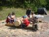 Náčelníci se snaží pro nás pravidelné ranní činnosti nějak ozvláštnit, aby nás každý den něčím trochu překvapil a pobavil. Docela se jim to daří. Posnídali jsme chléb, který včera upekla první skupina, a byl fantastický! Někteří ho ani nechtěli ničím namazat a jedli ho suchý, tak byl dobrý. Dopolední činnost, to byla výroba domácího mýdla a dokončení bubnozpěvotanců obou skupin. Už se těšíme na večerní představení u ohně! Oběd nás moc nezdržel, i polední klid utekl jako vítr, po něm ti, co ještě nepekli chleba, zadělali a dali se do pečení, a ti ostatní vyběhli do lesa a hráli tam pohybové hry. Ve tři hodiny jsme se všichni připravili na velkou vycházku se všemi zvířátky k rybníku Velký Mastník, kde máme plánované koupání. Cestou se vystřídáme na koníkách, proto bereme přilby a batůžky na záda (v nich máme pití a věci na koupání). U rybníka byla velká legrace a rybáři okolo toho asi moc nenachytali, dělali jsme docela slušný bugr - ale co se dalo dělat, takové osvěžení v tom vedru bylo třeba vyjádřit pěkně hlasitě. Dost nám přitom vyhládlo, a tak jsme s chutí spořádali guláš, který nám uvařila paní kuchařka venku na ohništi. Ani jsme netušili, že to tak umí - při návratu už bublal kotlík na trojnožce nad ohněm a voněl tak, že se po něm jen zaprášilo. Jedli jsme z ešusů. Někteří z nás ochutnali místo salátu i čerstvou kopřivu, Aleš nám ukázal, jak ji máme jíst, a byla docela dobrá. S plnými pupíky jsme přichystali dřevo na oheň a pak už jsme předvedli,co jsme nacvičili. Pokřiky byly opravdu povedené a byly odměněny velkým potleskem. Náčelníci vytáhli hudební nástroje a pak se zpívalo a hrálo až do tmy, kdy jsme vyrazili na noční procházku spící přírodou. Bez baterek, pochopitelně. Byla moc zajímavá, a ty, co se trochu báli, drželi vedoucí za ruku. Kdo chtěl, mohl spát venku u ohně, a řada z nás to také udělala. Usínámí pod hvězdami je úúúžasné!